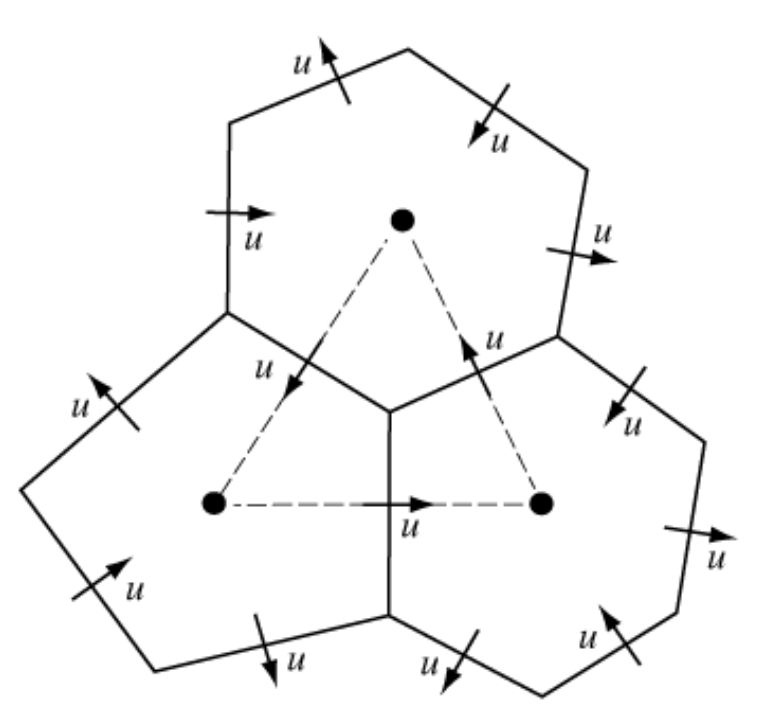 The defining feature of MPAS when compared to other models is that its unstructured grid is composed of Voronoi Meshes with a C-grid staggering. This means that the grid can be broken down into two meshes: Primal and Dual. The Primal Mesh is composed of Voronoi regions and the Dual Mesh is composed of Delaunay Triangles. The figure below showcases this relationship, with the dashed triangles being the dual of the Voronoi mesh.